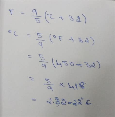 Where C is the temperature in Celsius and F is the temperature in Fahrenheit. To convert 450°F to Celsius, simply plug in the value of F into the formula and solve for C.